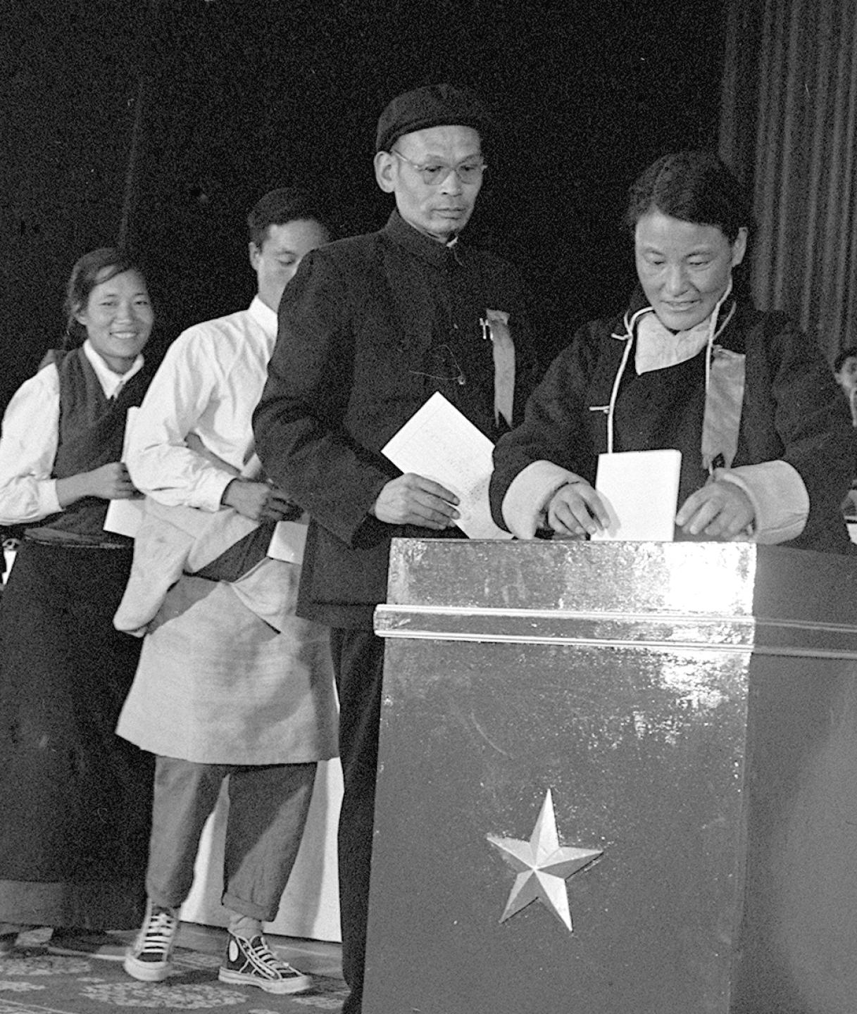 1965年9月,自治区第一届人民代表大会第一次会议的代表次仁拉姆(右一)正在投票。新华社记者袁克忠摄
