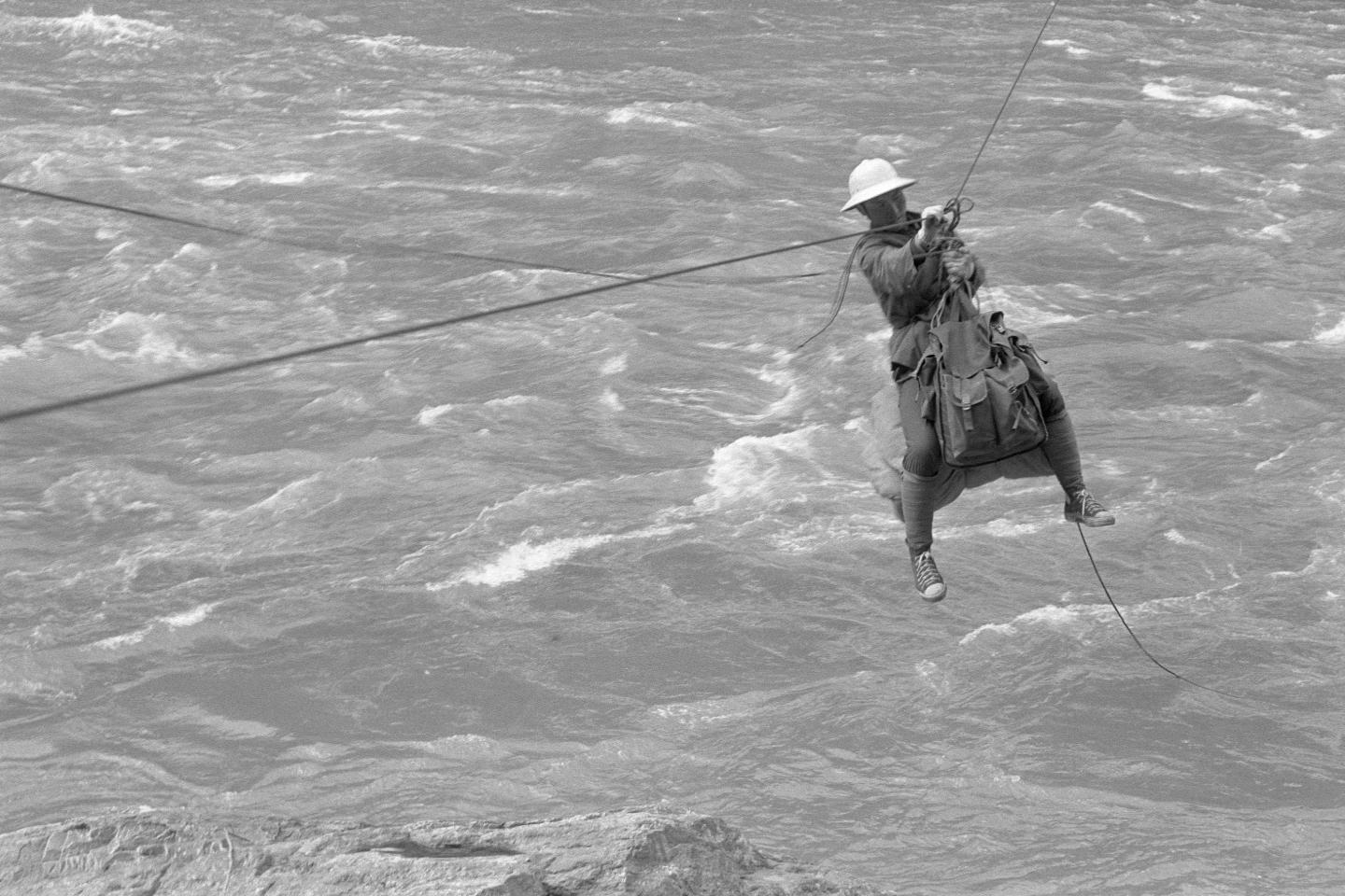 1983年,林业局考察队员通过雅鲁藏布江上的溜索过江。新华社记者 土登 摄