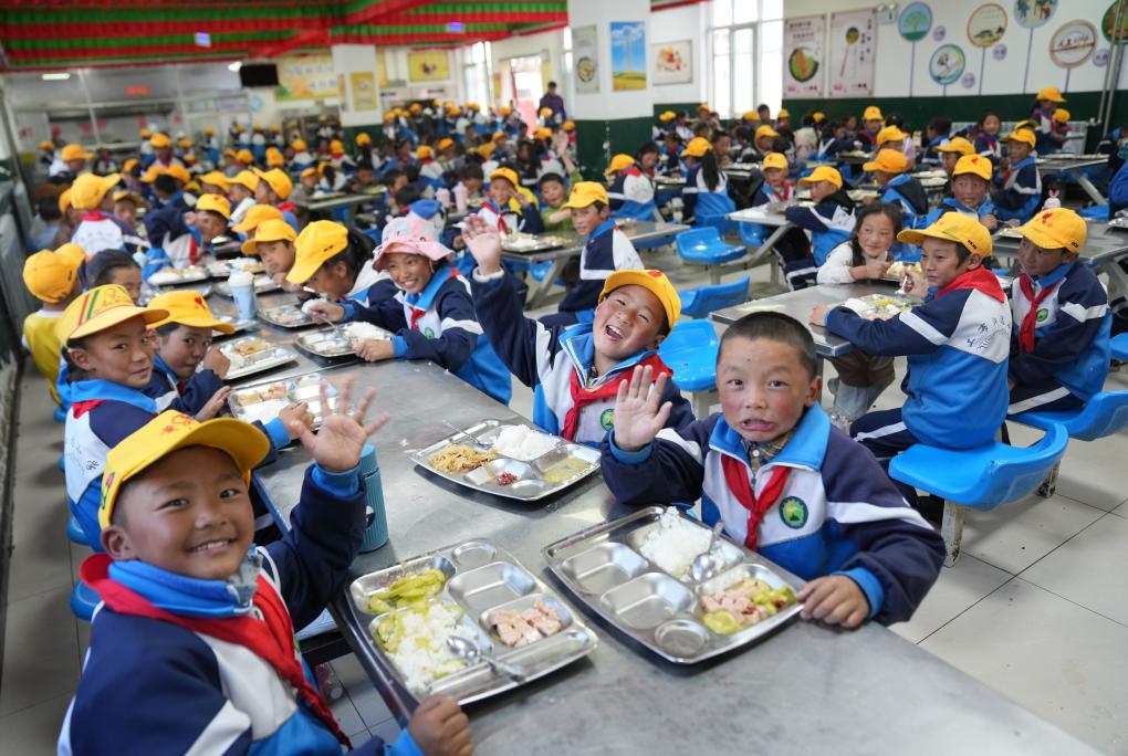 2024年9月3日,林芝市工布江达县娘蒲乡中心小学的学生们在享用午餐。新华社记者 晋美多吉 摄