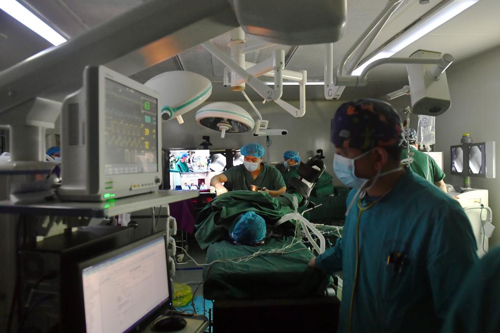 2021年4月19日,拉萨市人民医院骨科医生在北京积水潭医院专家远程指导下使用骨科机器人开展骨科手术。 新华社记者 孙瑞博摄