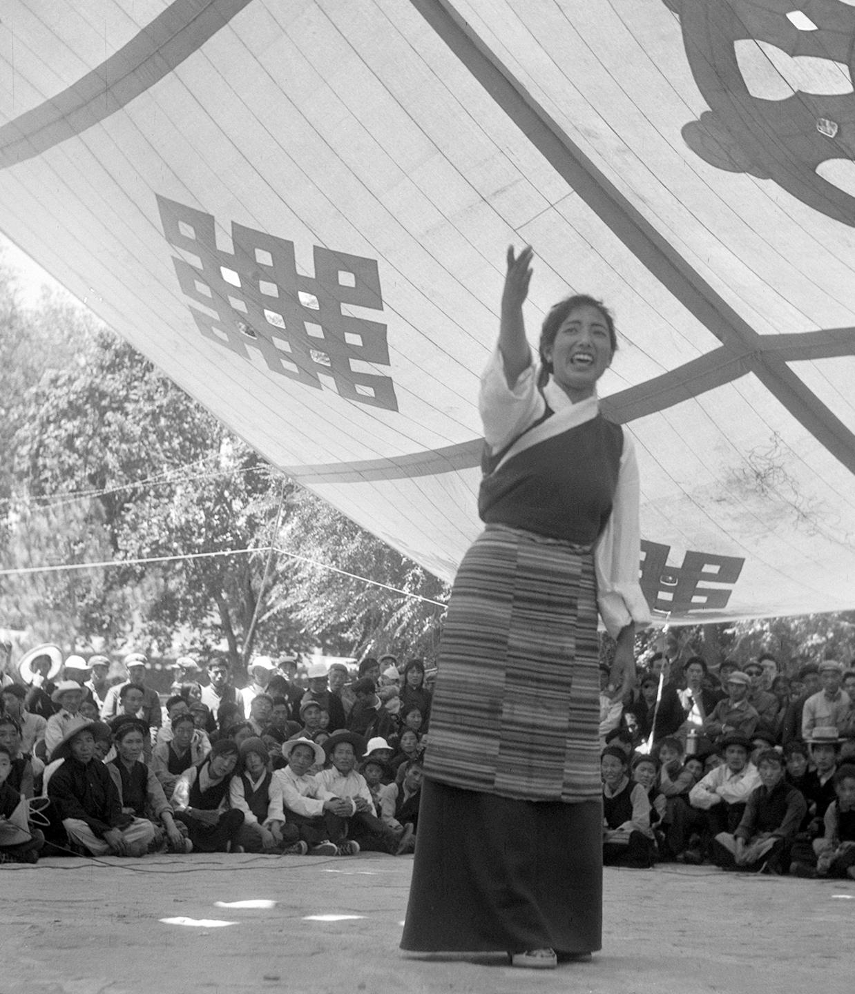 1965年10月,在拉萨各族各界群众庆祝自治区成立联欢会上,文化工作队队员雍西在演出。新华社记者 林枫 摄
