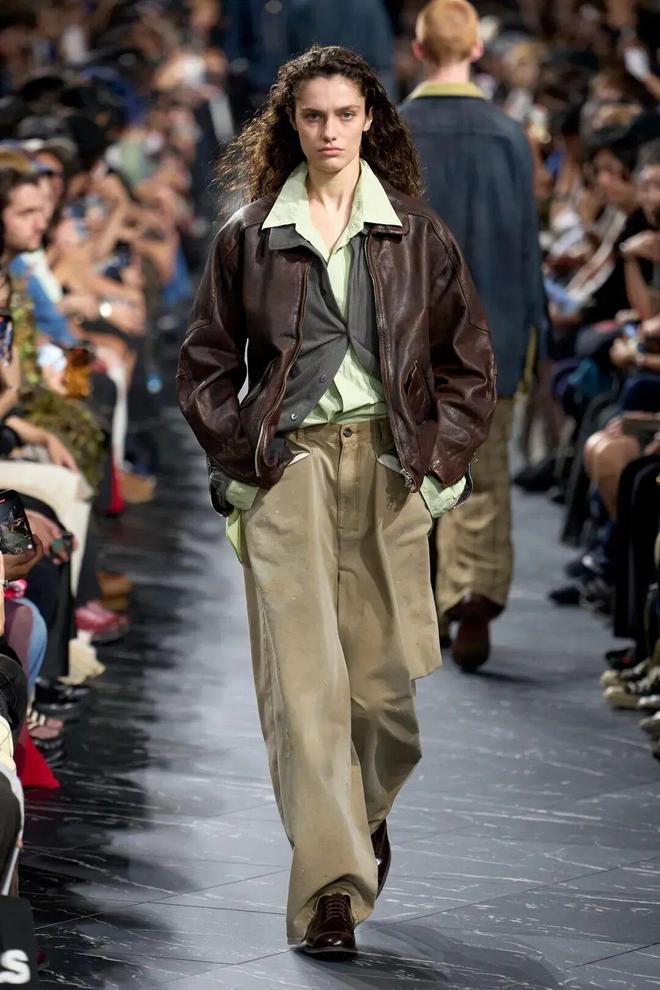 在ANCELLM 2026 春夏系列中,做旧工艺堪称一大亮点。品牌对面料进行了多轮复杂处理,打磨、褪色、涂层、磨损等工序环环相扣。例如一件厚重的皮夹克,先经过玻璃涂层增强其密度,赋予面料坚实的质感,随后再进行物理打磨,最终呈现出古铜色的陈旧表面。这一过程不仅让皮夹克有了复古韵味,更在细节处彰显出精致质感,仿佛是从时光长河中打捞出来的宝藏单品,每一道磨损痕迹、每一处褪色纹理,都凝聚着品牌对工艺的执着与匠心。