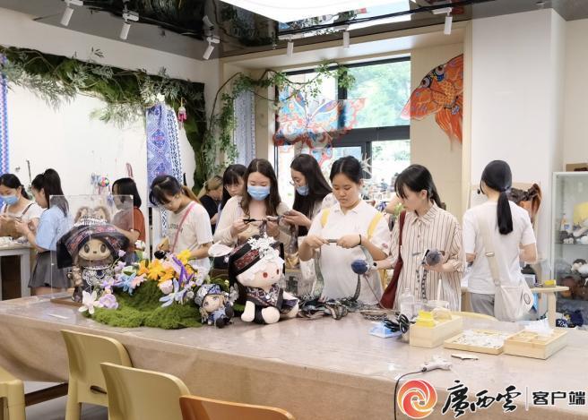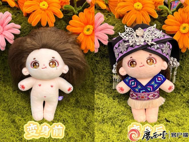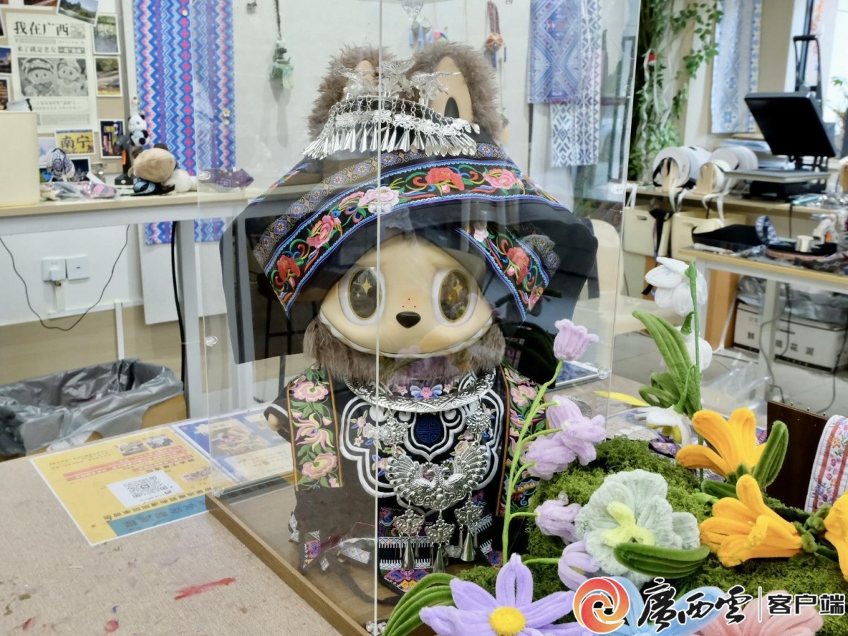 身披十字花纹壮锦,头戴双角形头巾、颈挂银项圈……在自治区博物馆的瓯骆工坊内,一个个身着壮、瑶、苗等少数民族服饰的玩偶娃娃错落摆放,长条置物桌好似成了它们服装秀的T台。