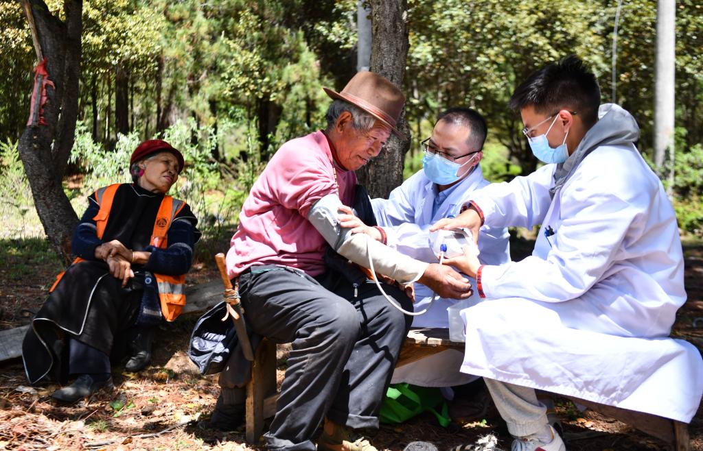 2023年6月12日,广东援藏医生王振疆(右二)和本地医生尼玛益西(右一)在米林市吞布容村,给村民普布多吉检查身体。新华社记者 晋美多吉 摄