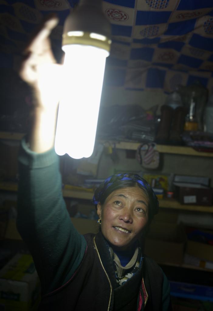 2013年6月7日,浪卡子县普玛江塘乡牧民在家里使用太阳能照明设备。新华社记者 普布扎西 摄