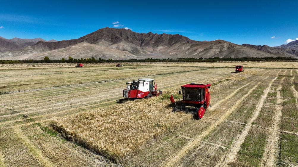 2022年9月19日,日喀则市江孜县热索乡努康村农机合作社的村民集中对村里三千多亩耕地进行机械化收割。新华社记者晋美多吉 摄