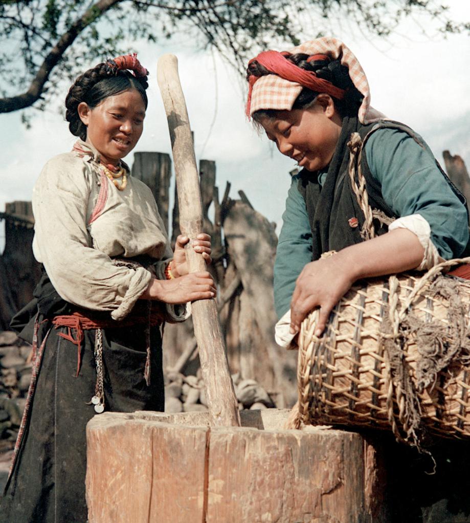 1965年,国营澎波农场的藏族工人在使用农机脱粒。新华社记者 吴祖政 摄