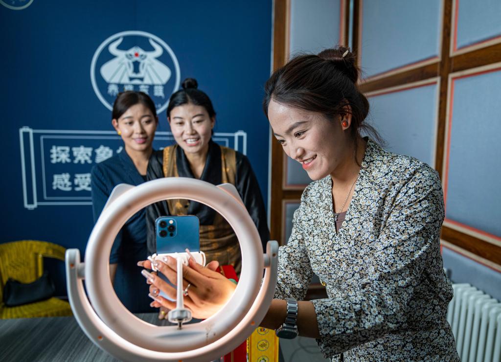 2023年10月29日,在那曲巴青县“赤堆东雄”直播间,主播朗贡旺姆调试直播设备。新华社记者 孙非 摄