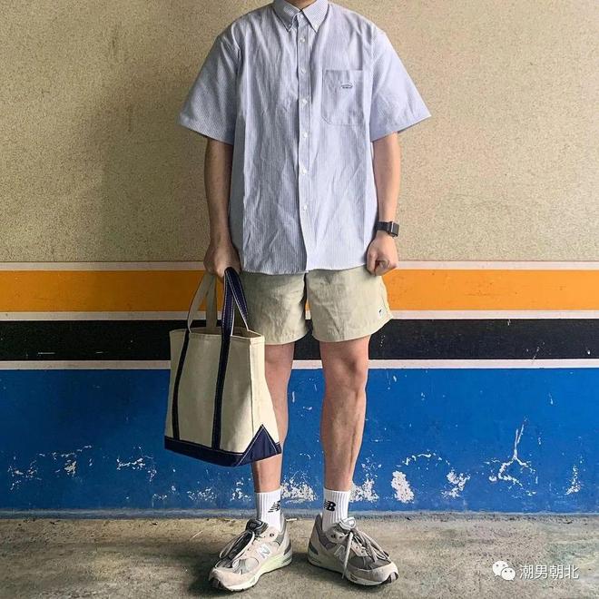 搭配要点:浅灰色衬衫作为外搭,为整体造型增添了一份儒雅与知性。下身搭配卡其色短裤,卡其色温暖质朴的色调与浅灰色衬衫相互映衬,碰撞出独特的时尚火花。最后搭配一双NB鞋,与整体色调相呼应,使整套穿搭更加协调统一。