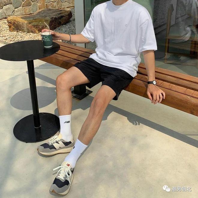 搭配要点:白色T恤与黑色短裤形成经典的黑白配色,简洁大方且极具时尚感,短裤的长度建议控制在膝盖上方,在夏日更显清爽利落,同时拉长腿部线条,优化身材比例。搭配一双NB潮鞋,为整套穿搭注入活力与潮流元素。